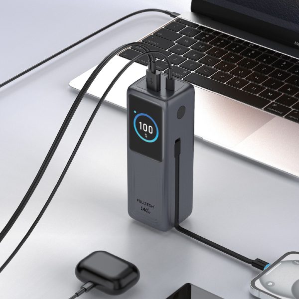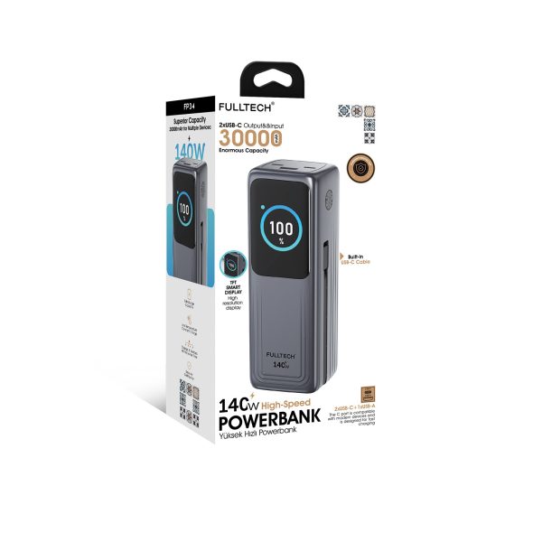 Fulltech FP34 140W 30.000mAh Akıllı Ekranlı Hızlı Şarj Powerbank 2xUSB-C & Dahili Kablo 4 Cihaz Şarj