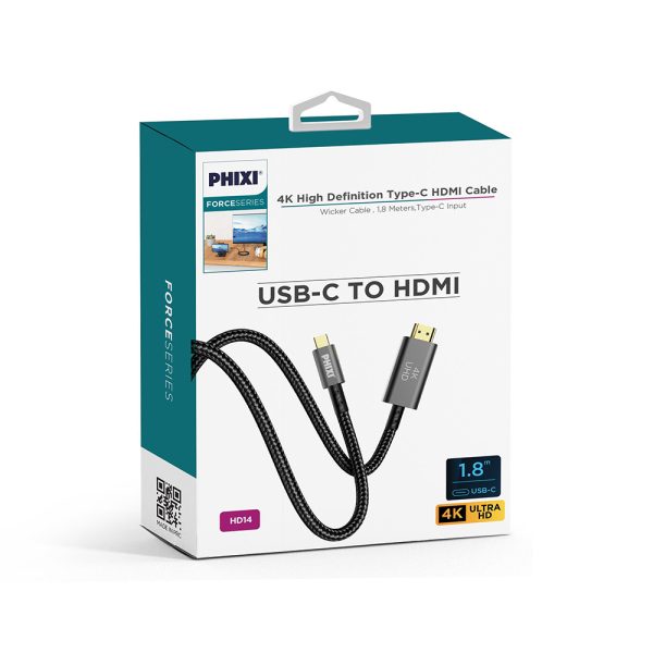 PHIXI Force HD14 | Type-C to HDMI 4K Görüntü Aktarma Kablosu – 1.8 Metre | Hasır Dış Kaplama